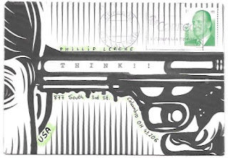 Great black and white envelope from Eva, sent this summer. Clever green highlights on the address to match the stamp.