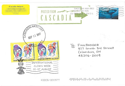 This excellent documentation of the Cascadia Clown Parade arrived in time for Halloween in this envelope - I love the artistamps.