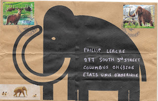 This fantastic envelope is made from a paper bag, sent in 2017) from the now defunct French grocery chain, Mammouth. Eric says the bags are somewhat of a collectors item now.