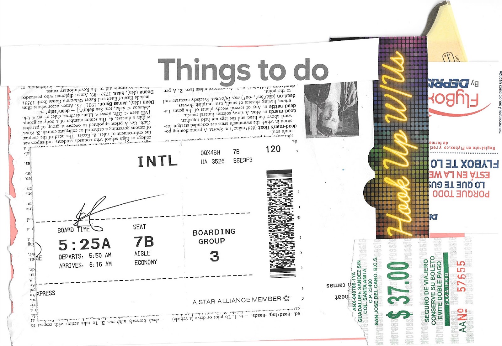 I created collages, one for each envelope, from found objects, including an abandoned dictionary, a cigarette packet left to rot in the rain, and things in the bottom and side pockets of my backpack.