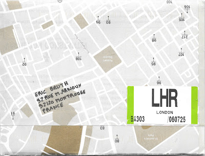 Eric was on vacation in London, and improvised this great mail art envelope from a tourist street map and some puffy stickers, which all traveled really well. Loving the LHR sticker addition and the fantastic postage sticker featuring the post office railway system that operated under the city from 1927-2003.