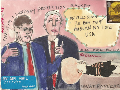 February 10, 2020 - We are thrilled to welcome dear mail art friend Rebecca Guyver to the Glam Faction! She sent us this "aesthetically correct" Post-MinXus card (done right, as they say). And we, fashionably late as ever, share it with you, our faithful Glamsters! Our dear RG shows you how Post-MinXus is done. (She has also gone a tad political.)