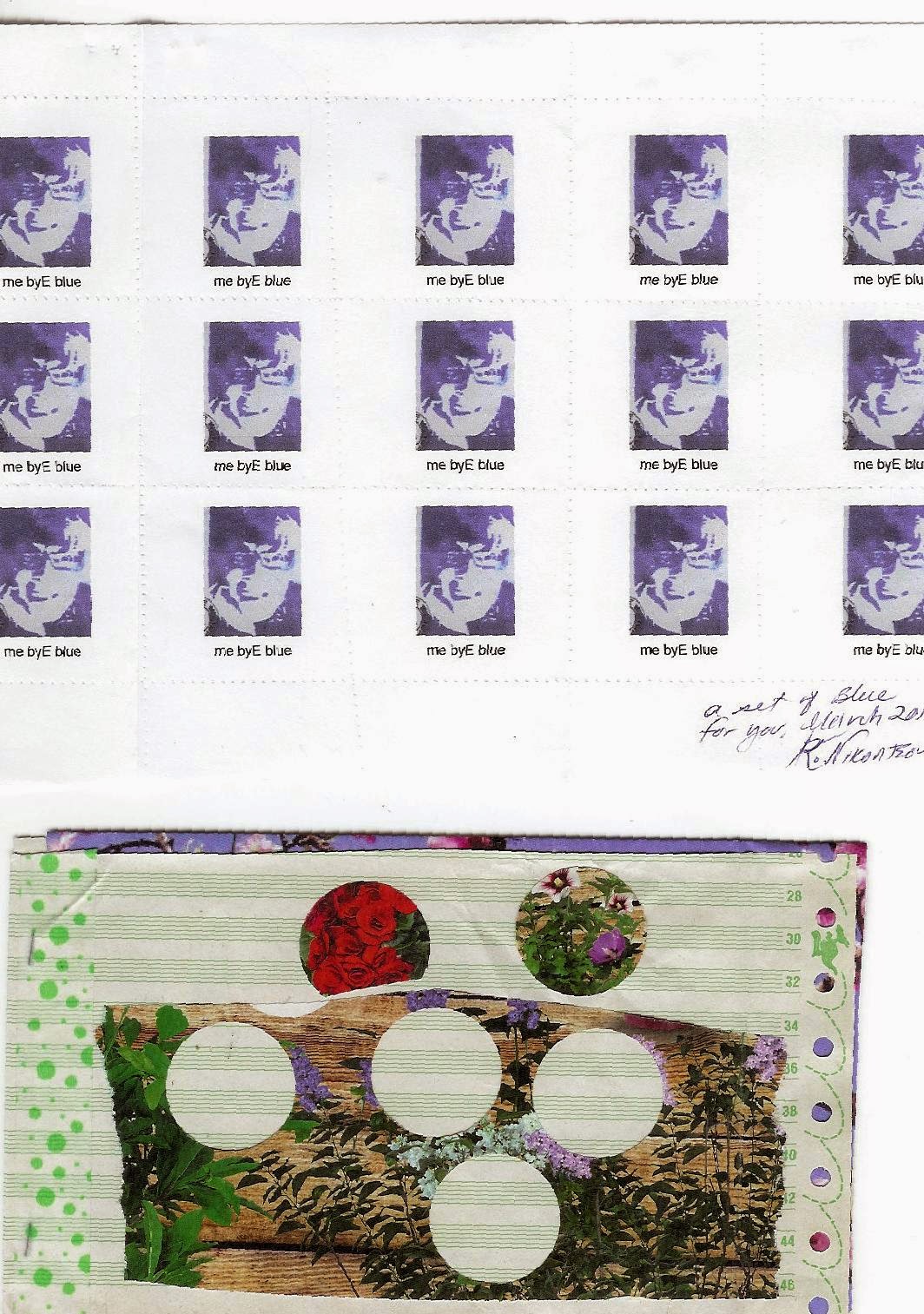 And inside was a great surprise - some faux stamps of Kat in her favorite blue, and my first mail art book - sent on vintage computer paper based largely on papers sent to Thessaloniki by none other than the Haptic Werewolf himself.