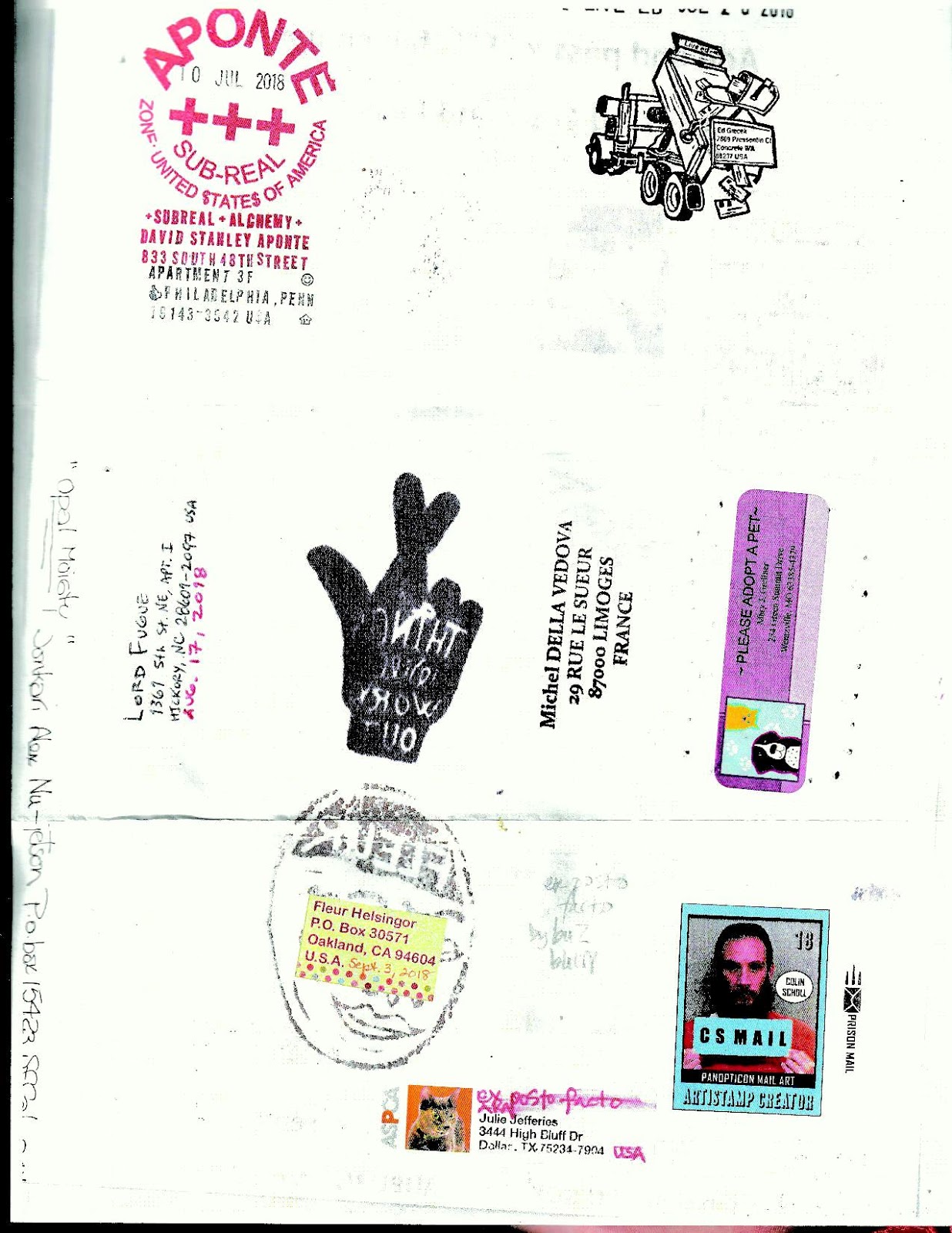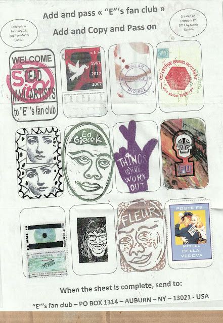 December 30, 2019 - The add & pass sheets honoring the great French mail artist E- Ambassador of Utopia are still circulating and I continue to be the recipient of completed work. While I did not volunteer for this position, I am certainly willing to do my best to document this effort, now at Glam Faction and IUOMA-Ning.