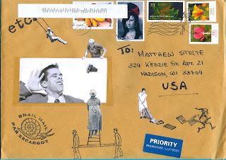 My mailbox 1st began to fill with heavily worked on postcards from Jon Foster (2), Joey Patrickt & David Stanley Aponte, along with a similar sized envelope from Mete Sarabi with a drawing of "Safari Pirate" on the back, filled with add & passes.